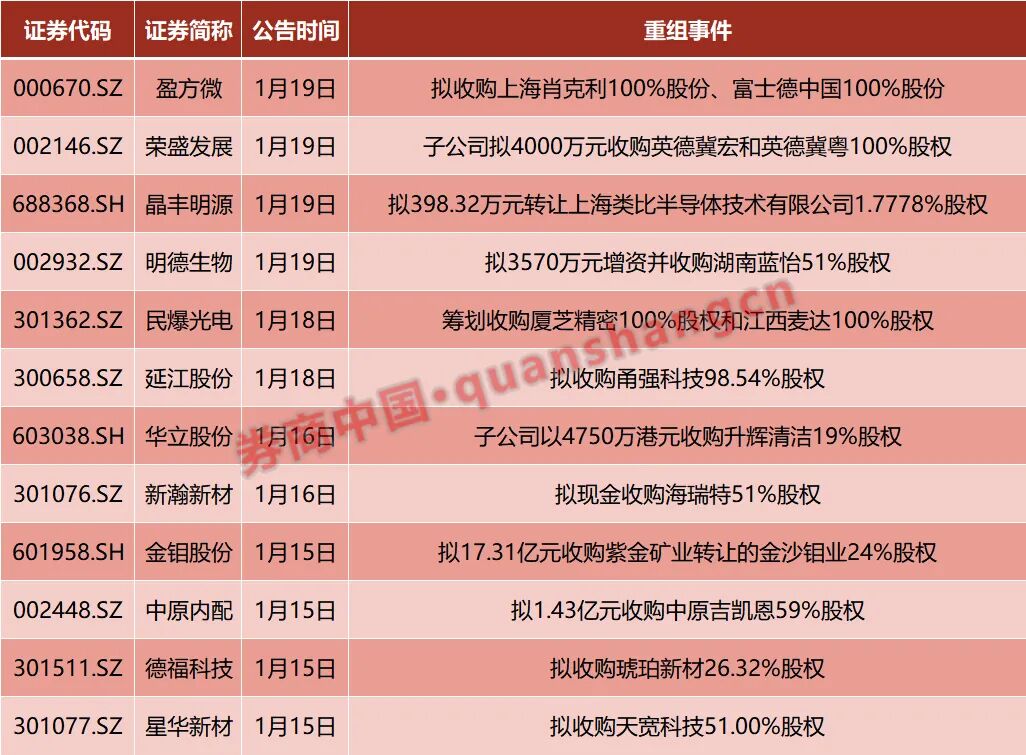 2026年以来,A股并购重组市场持续活跃,据不完全统计,1月15日以来,包括盈方微、荣盛发展、晶丰明源、明德生物(002932)、延江股份、民爆光电、新瀚新材(301076)、华立股份(603038)、星华新材(301077)、德福科技(301511)、中原内配(002448)、金钼股份(601958)的12家A股上市公司披露了并购重组进展最新公告。